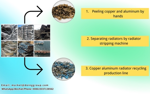 This is the whole process of how to get copper out of radiator by using copper aluminum radiator recycling machine. By using the copper aluminum radiator recycling machine, you will get high purity copper up to 99%. Besides, our DOING company has many kinds of radiator recycling machine. By using copper aluminum radiator recycling machine, you will get copper metal from radiator. And by using stripping type radiator recycling machine, you will get entire copper tube. You can choose what kind of machine you want according to your need.